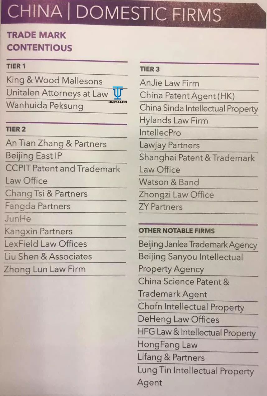 | Recently, the internationally acclaimed IP media "Managing Intellectual Property" (MIP) announced the "2019 IP Star Trademark Business Ranking", Unitalen, once again, found among the Tier 1 in China in the field of trademark application and trademark litigation.