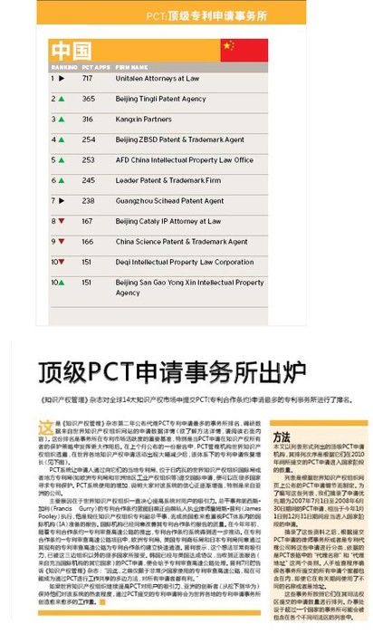 全球知名知識產權雜志Managing Intellectual Property(MIP)公布了中國事務所的PCT(專利合作條約)申請排名,在申請日(優先權日)介于2007年7月1日至2008年6月30日之間、30個月的絕限落在2010年1月至2010年12月間的已公開的PCT申請中,集佳知識產權代理有限公司以717件申請在中國代理機構排名中位列第一。2011-05-17