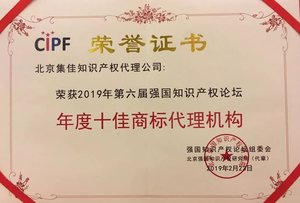 ![]() | 集佳獲2019第六屆強國知識產權論壇“十佳商標代理機構”榮譽稱號2月23日,由強國知識產權論壇組委會和北京強國知識產權研究院主辦的“2019強國知識產權論壇新春分享會暨服務業頒獎典禮”在北京大學博雅國際酒店舉行。集佳在本年度強國知識產權論壇服務業“十佳”評比中獲得“年度十佳商標代理機構”榮譽稱號,集佳合伙人趙雷律師參加會議并代表集佳領取榮譽證書... |