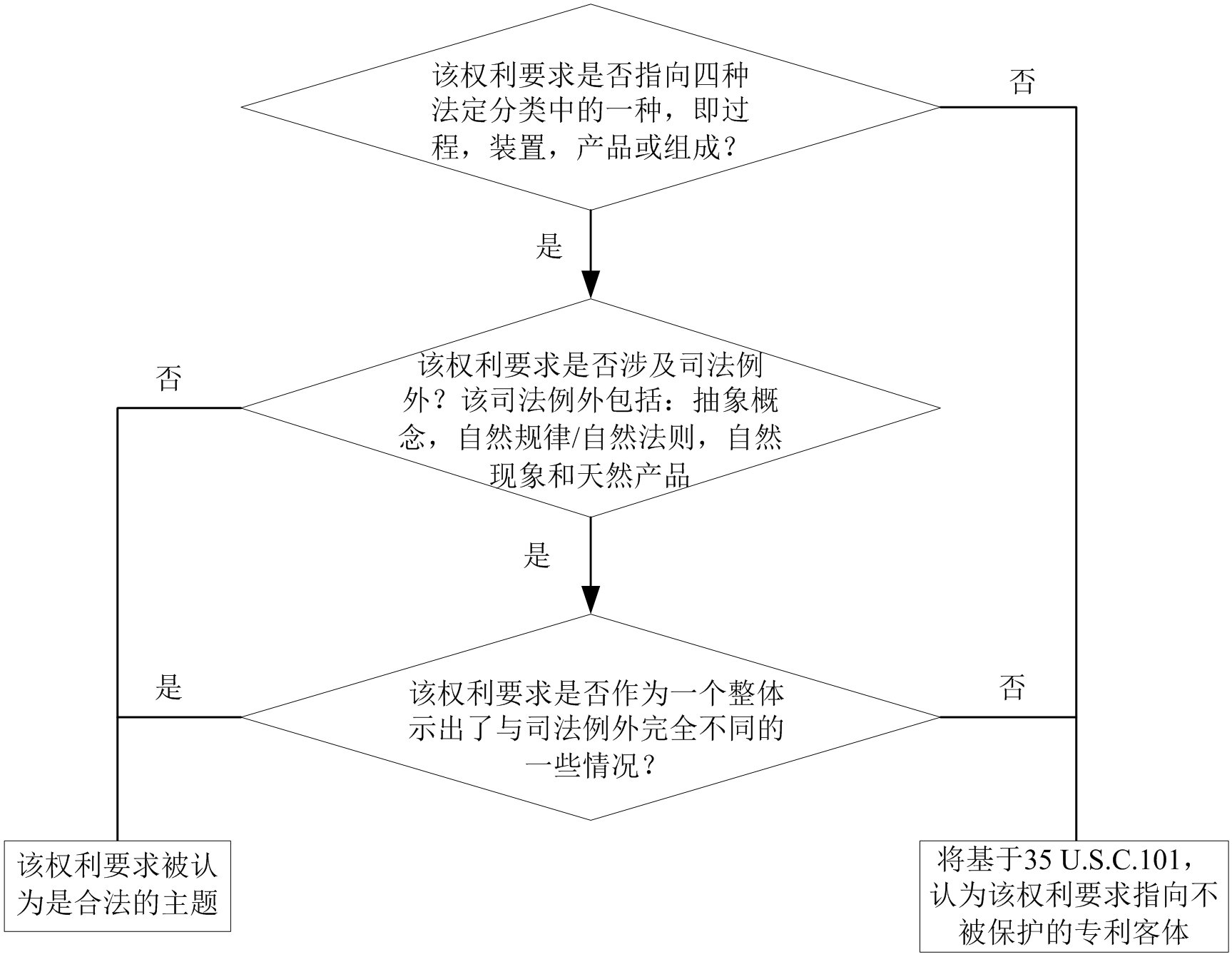 如果不是這四種法定分類中的一種,則該權利要求被認為不是專利保護客體,其將基于35 U.S.C.101被拒絕。如果是,則過程進入問題2。
