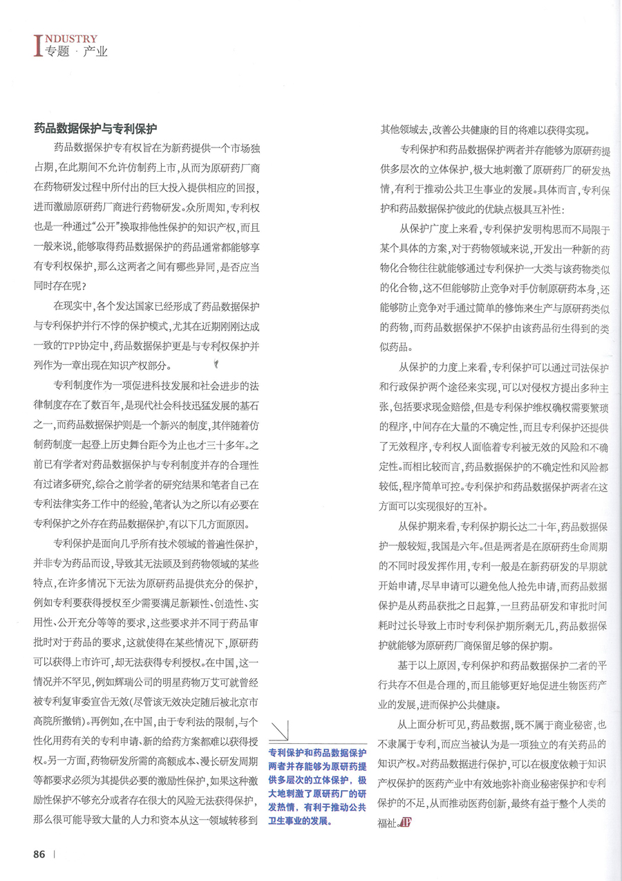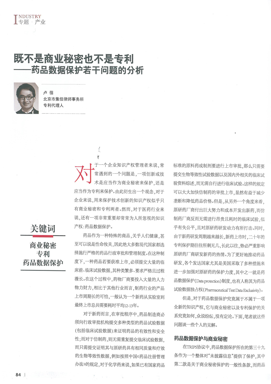 首頁 > 集佳知識產權代理有限公司 > 理論研究 > 媒體報道 > 集佳文章《既不是商業秘密也不是專利--藥品數據保護若干問題的分析》在《中國知識產權》發表