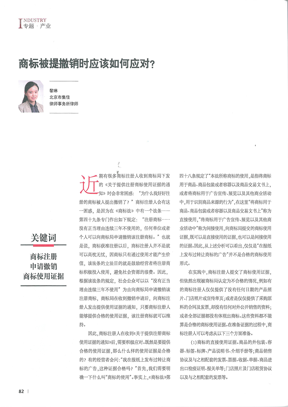 集佳律師黎琳文章《商標被提撤銷時應該如何應對》在《中國知識產權》發表
