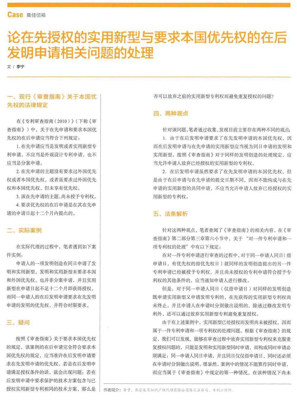 集佳代理人文章《論在先授權的實用新型與要求本國優先權的在后發明申請相關問題的處理》在《電子知識產權》發表