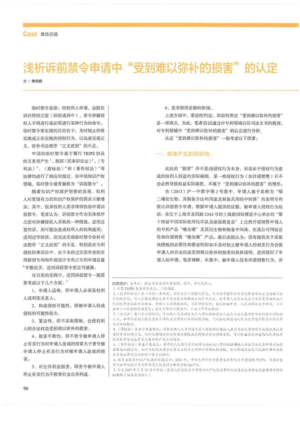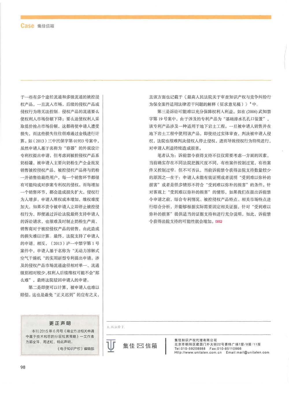 集佳律師文章《淺析訴前禁令申請中“受到難以彌補的損害”的認定》在《電子知識產權》發表