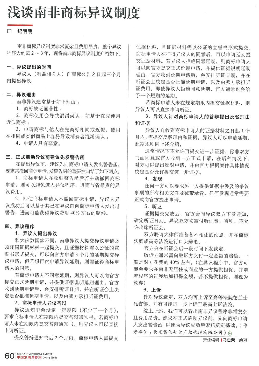 集佳代理人文章《淺談南非商標異議制度》被《中國發明與專利》發表