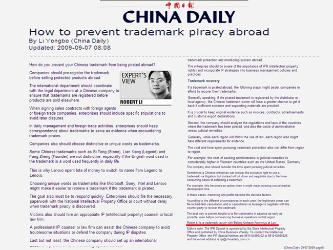 《CHINA DAILY》:How to prevent trademark piracy abroad