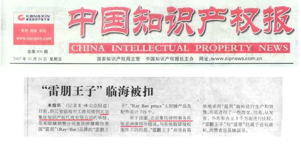 《中國知識產權報》:“雷朋王子”臨海被扣
