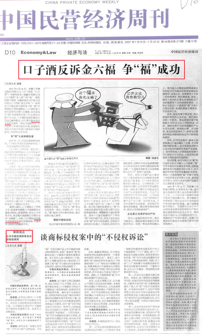《中國民營經濟周刊》整版報道口子福不侵權訴訟案