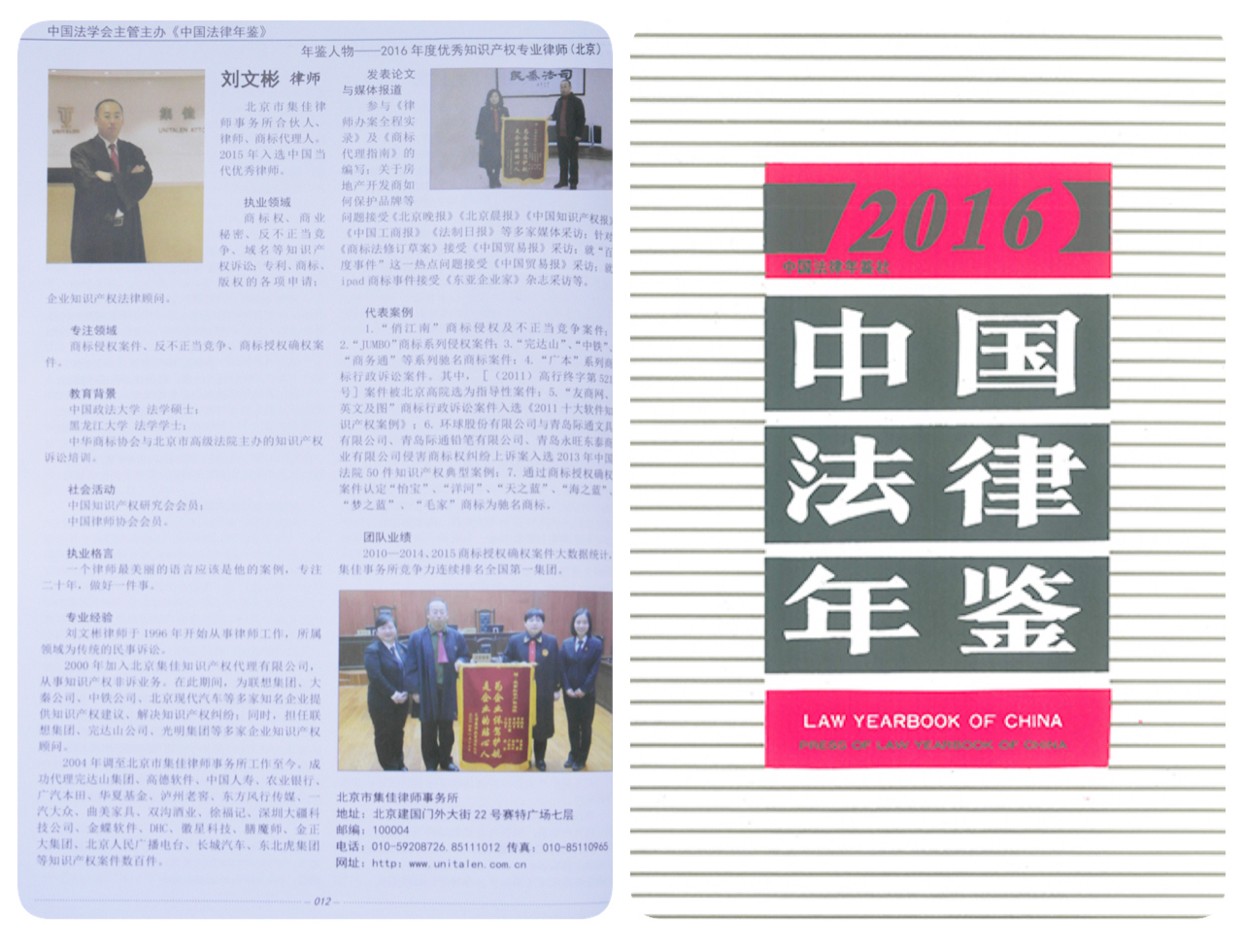 日前,由中國法學會主辦的《2016中國法律年鑒》正式出版發行,集佳律師事務所合伙人劉文彬律師入選“年鑒人物——2016年度優秀知識產權專業律師”。