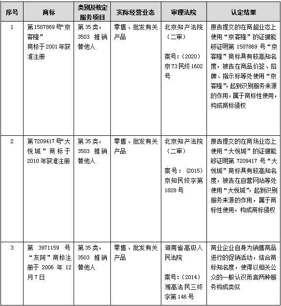 但對于熟悉商標授權確權程序和商標民事侵權訴訟的代理人而言,一個耐人尋味的現象是2011年至今全國各地法院審理的商標民事侵權訴訟認定結果卻與上述系列商標行政訴訟認定結果大相徑庭,例如:四川高院2011年和廣東高院2014年判決的好又多案【16】,北京知識產權法院2015年和2020年判決的大悅城和京客隆案【17】,湖南高院判決的友阿案【18】,山東高院判決的谷子案【19】等均無一例外認為批發零售與推銷替他人構成類似服務。對于這種商標民事侵權與商標授權確權兩程序中出現的差異,作為審理商標授權確權行政訴訟的二審法院,北京高院知識產權庭在2017年《商標授權確權行政案件相關疑難問題的調研報告(三)》【20】一文中給予了回應,其認為應當區分在商標民事糾紛中對商標專用權的保護和在商標權撤銷復審行政糾紛中對商標專用權維持有效制度的差異,在商標民事侵權案件中,對商標專用權的保護體現為“禁用權”所限定的范圍,其是以法律所規定的侵害他人注冊商標專用權為基礎,以是否會造成商品的來源混淆為落腳點,而發生混淆的范圍不僅及于注冊商標所核定使用的相同商品或服務,也包括了類似商品或服務,而對類似商品或服務的判斷,是從功能、用途、生產部門、銷售渠道、消費群體、服務對象、內容、方式等方面進行的認知。故商標禁用權的范圍顯然超過了專用權。