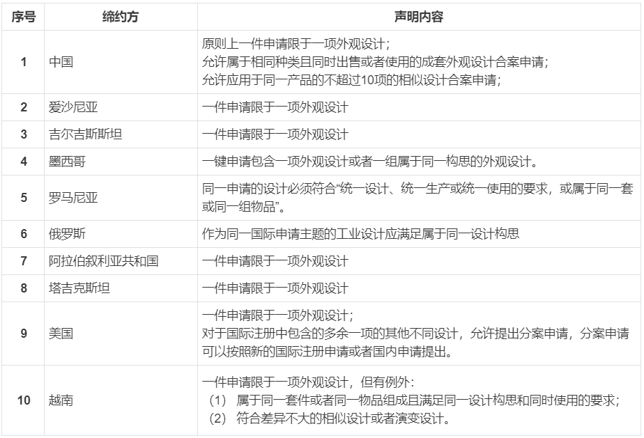通過海牙體系提交國際注冊申請,一件申請中最多可以包含不超過100項外觀設計,前提是這些外觀設計同屬于同一大類(洛迦諾分類)。不過,并不是所有締約方的法律都放開了合案申請的外觀設計的限制。如果根據其國內法律規定,不允許就不同外觀設計進行合案或者對合案數量有所限制,則該締約方必須提前向國際局提出聲明,下列為目前作出聲明的締約方及其聲明的內容: