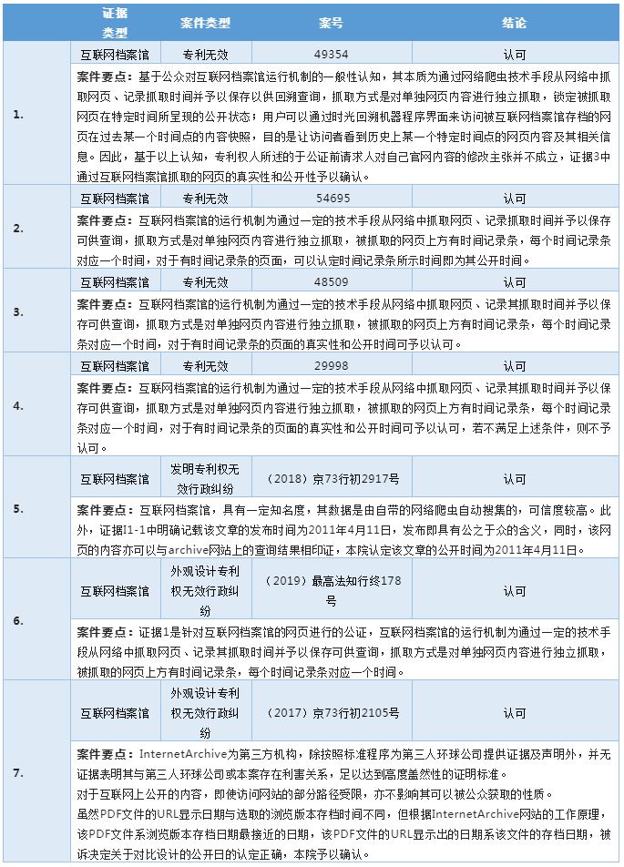 互聯網檔案館(Internet Archive)是一家以普及利用所有知識為目標的非營利性數字圖書館。互聯網檔案館提供永久存儲和免費的公共訪問的數字化材料信息集合,讓公眾上傳和下載數字材料到其數據集群,但其大部分數據是靠其網絡爬蟲自動收集。互聯網檔案館的Web歸檔文件系統Wayback機器包含了超過1500億以上的網頁存檔。有別于其他類型的網絡證據,互聯網檔案館較為特殊,其本質上屬于可溯源的歷史上曾存在的網頁資源記錄,在抓取網頁信息時即可證明該網頁相關信息處于公開狀態,并且互聯網檔案館會記錄抓取信息的時間。下表是認定互聯網檔案館網絡證據的案例梳理。