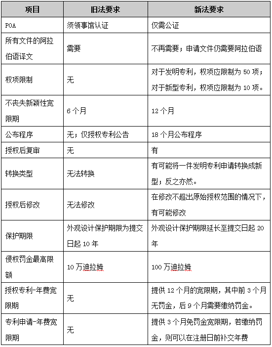 新法將不喪失新穎性的寬限期由6個月延長至12個月,且根據舊法只有出版物公開以及阿聯酋國家認可的展會中的披露才可以利用不喪失新穎性的寬限規定,在實踐中基本無法實施。根據新法,不喪失新穎性的披露行為擴展至任何國內外的披露行為,包括展會展示、文章等。