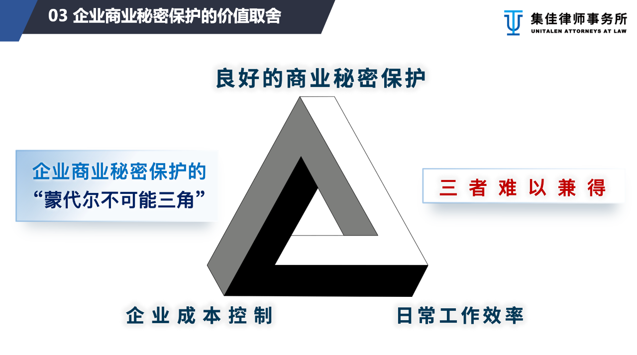 蒙代爾不可能三角又稱三元悖論,通常應用于宏觀經濟學,其本質是指基于特定的情形下,三種不同位面的價值難以同時實現,最多只能同時滿足兩個目標,而放棄另外一個目標。【19】在企業商業秘密保護中,同樣會面臨著三元悖論的局面,即“良好的商業秘密保護”,“企業成本控制”及“日常工作效率”三者之間難以兼得。例如,在基于優先保護企業商業秘密,同時兼顧企業成本的基礎之下所采取的保密措施,對企業日常運營的工作效率必然會有一定程度的影響。企業所采取常見的措施包括限制個人電腦的使用、禁用通訊軟件及設備的使用、涉密材料的接觸及借閱等需多級審批、員工離職調崗的脫密流程等。而為實現相同等級商密保護的基礎之下,降低運營行政成本提升工作效率,則勢必需要應用技術監管手段及管理體系,比如信息安全設備及配套軟件,防數據泄漏軟件,區域監控設備等,這無疑亦會增加企業運營成本。