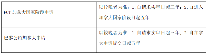 實審必須在加拿大申請日后四年內請求并支付審查費。因此,對于PCT國家階段申請,如果該PCT申請要求了優先權,審查請求可以推遲到進入加拿大國家階段后30個月內提出。分案申請的規則有所不同,分案申請可以在母案授權前一天提交,并且可以提交“多代”分案申請。分案申請的審查請求和費用須在最早母案申請日起四年或分案申請“提交日”后三個月內(以較晚者為準)提交。