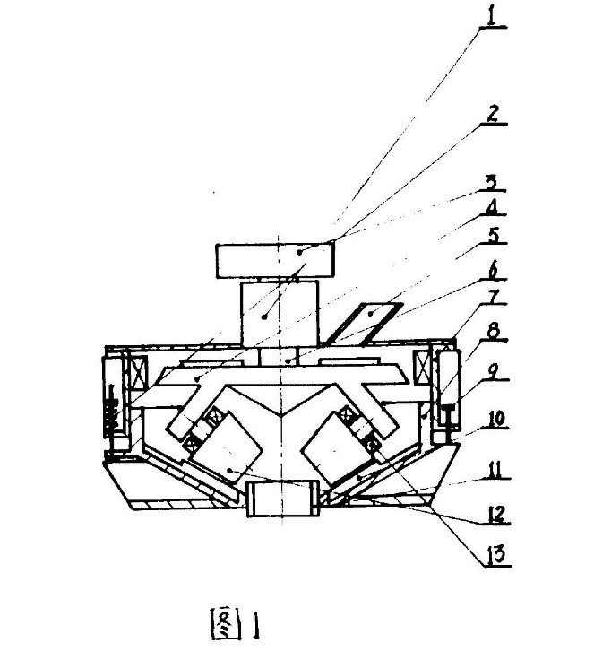 上述對比文件(雷蒙機)的附圖中,其磨輥和磨盤兩者磨面的外輪廓線與地面垂直,且二者的軸心線平行。因此,磨輥與磨盤的相對位置關系僅為簡單的內外關系(完全內側),也即是二者磨面的外輪廓線與軸心線均與地面垂直,并不存在上下關系。然而,在本專利的主要實施例中,磨輥與磨盤之間存在著上下關系,呈斜上方布置,參見下述該專利的附圖1: