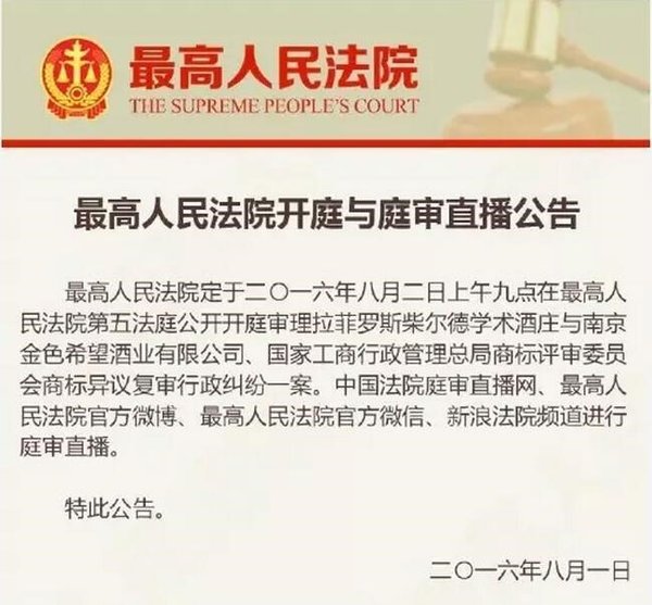 •    2017年4月24日,最高人民法院發布“2016年中國法院知識產權司法保護十大案件”,由集佳訴訟團隊代理的“拉菲羅斯柴爾德酒莊與國家工商行政管理總局商標評審委員會、南京金色希望酒業有限公司商標爭議行政糾紛再審案”榮登榜單。