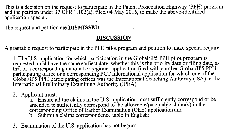 b)PPH駁回通知(摘錄示例如下圖):該通知為補正類通知,答復期限為自發文日起1個月或30天(以后到期的為準)內,應根據通知中所指出的缺陷進行補正,以滿足PPH的全部要求。