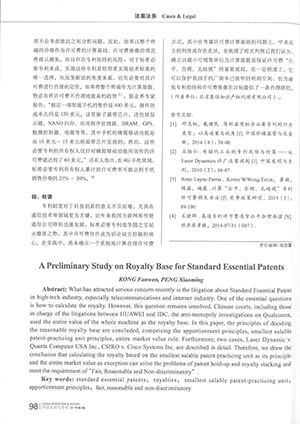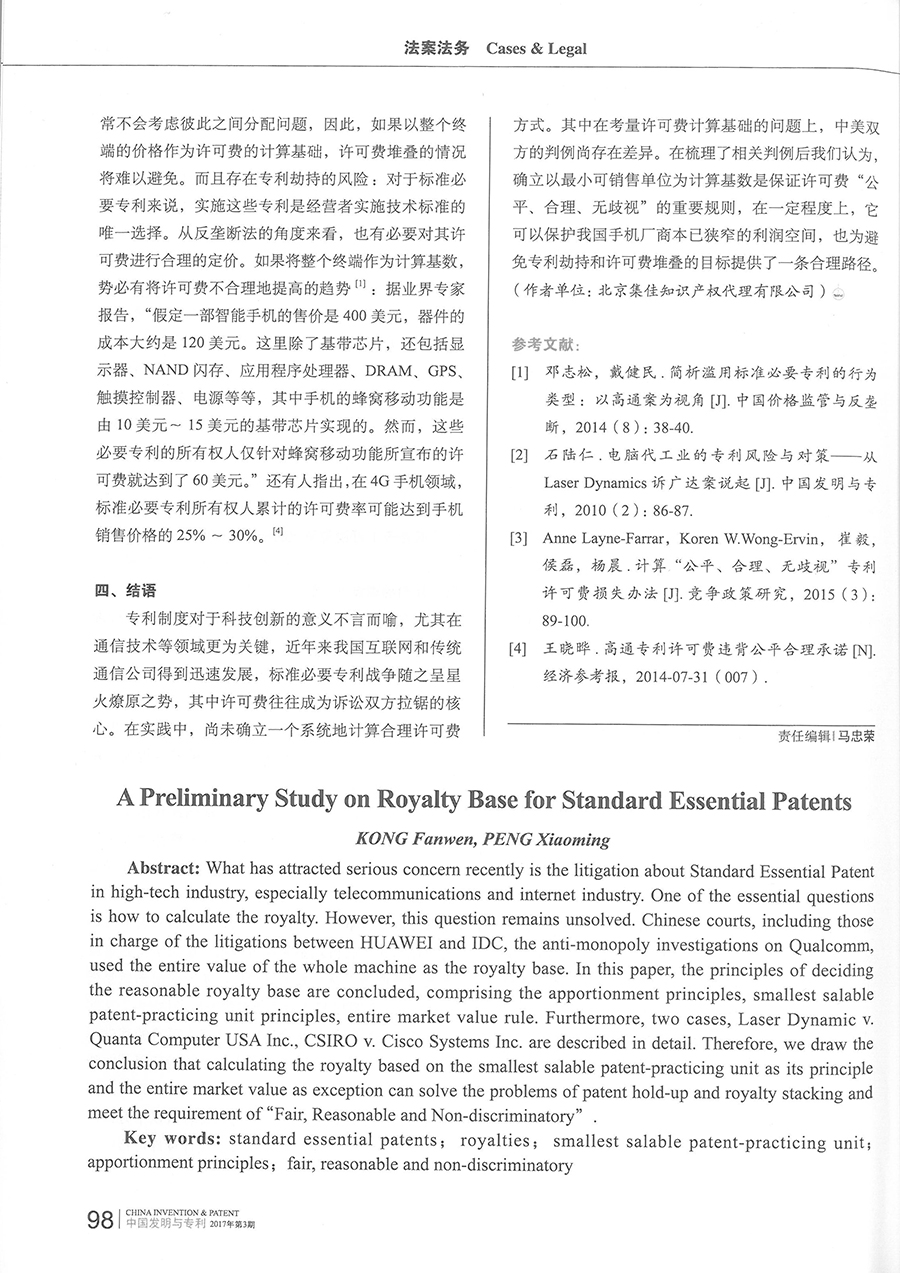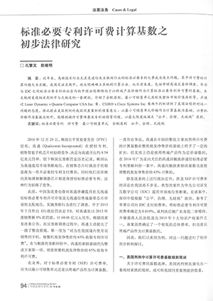 集佳文章《標準必要專利許可費計算基數之初步法律研究》在《中國發明與專利》發表