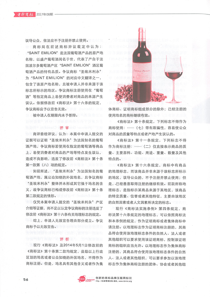 集佳文章《地名商標的可注冊性分析——評“圣埃米利永”商標無效宣告案》在《中華商標》發表