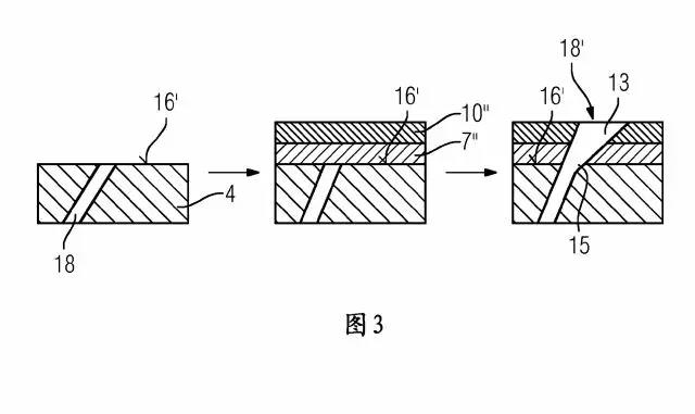 而本申請涉及的是一種重新制造具有擴散器的貫通孔的方法,其用于新構件。從圖3可知,首先在襯底4中加工出貫通孔18,此時在襯底4中并不具有擴散器部分15;然后進行覆層;最后制造擴散器13,即首次為所述擴散器13移除所述襯底4的擴散器部分15中的附加的材料。也就是說,在覆層前在襯底4中并不具有擴散器部分15。