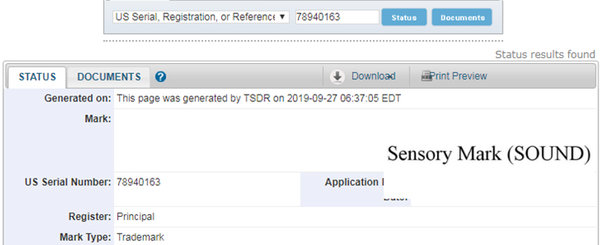 聲音商標在官網的頁面上顯示為SENSORY MARK (SOUND),其在申請文件頁面的Mark部分為一段音軌,具體如下: