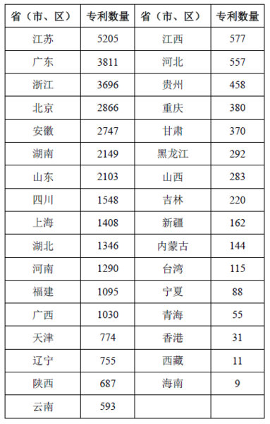 申請專利數量越多的省市,在該領域相對更加重視,也擁有更好的技術優勢。從表2可知,申請量排名前五的省市依次為江蘇(5205件)、廣東(3811件)、浙江(3696件)、北京(2866件)和安徽(2747件),這五省市總計申請了18325件,占據分析專利總量的半壁江山(49.7%)。申請量前十的省市則占到了分析專利總量的72.9%(26879件),并且西部地區僅有四川(1548件)躋身申請量前十。