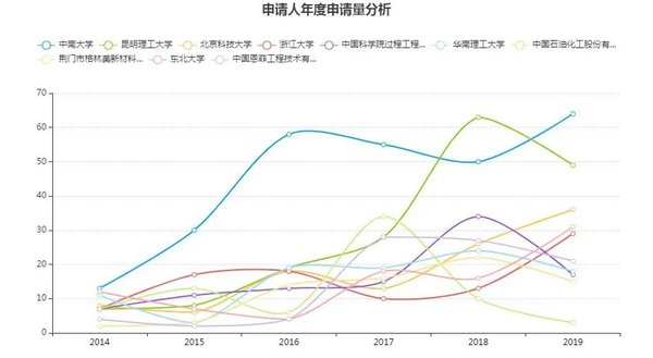 分年度看,如圖5,申請人在近些年的申請趨勢總體變化不大。其中中國石油化工股份有限公司的申請量在2017年達到高峰后,近兩年有所下降;而昆明理工大學在2017年之后、浙江大學和東北大學在2018年之后都有明顯的發力,這可能表明各個申請人在相應領域的研發成果有所波動,其更深的后果有待更多觀察。