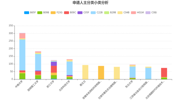 安徽未名鼎和環保有限公司的申請全部為F23G(焚化爐;廢物或低品位燃料的焚毀),這和該公司的主營業務(生活垃圾熱解)保持一致。浙江大學、北京高能時代環境技術股份有限公司的專利申請以B09C(污染的土壤的再生)為主。值得注意的是,在本小節分析的十個主體中,浙江大學的技術分類分散程度最高,顯示出其在多個技術方向上的發展較為均衡,體現出較強的綜合實力。此外,據查詢,高能時代公司是土壤修復產業的龍頭公司,其在污染土壤的再生領域擁有較強的研發實力。