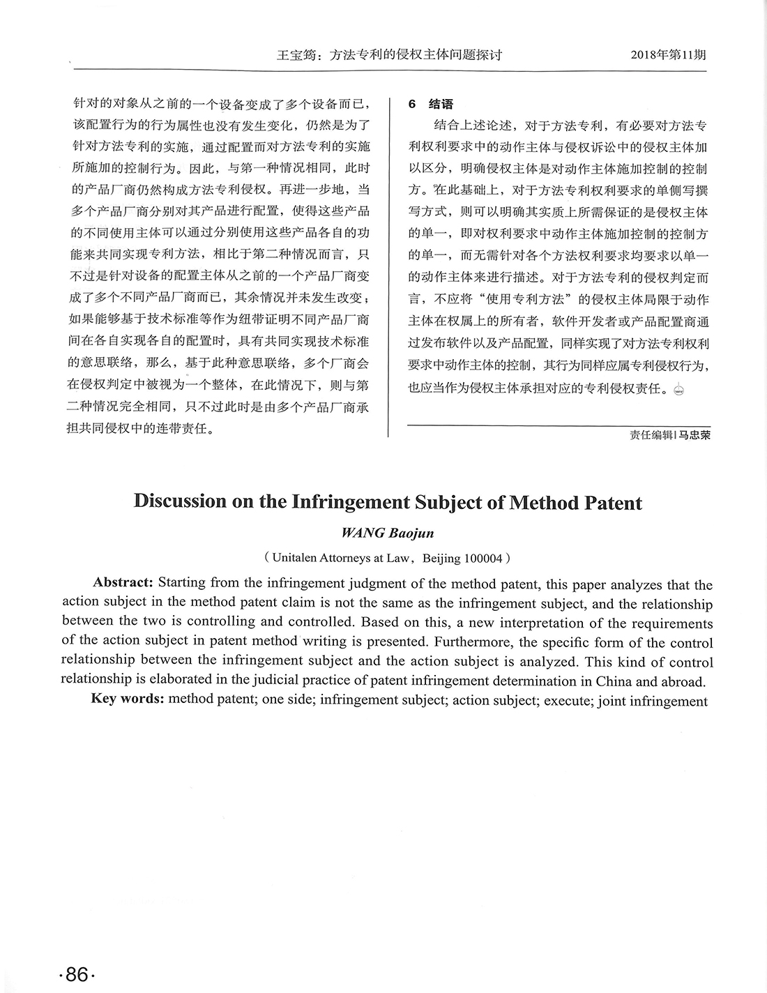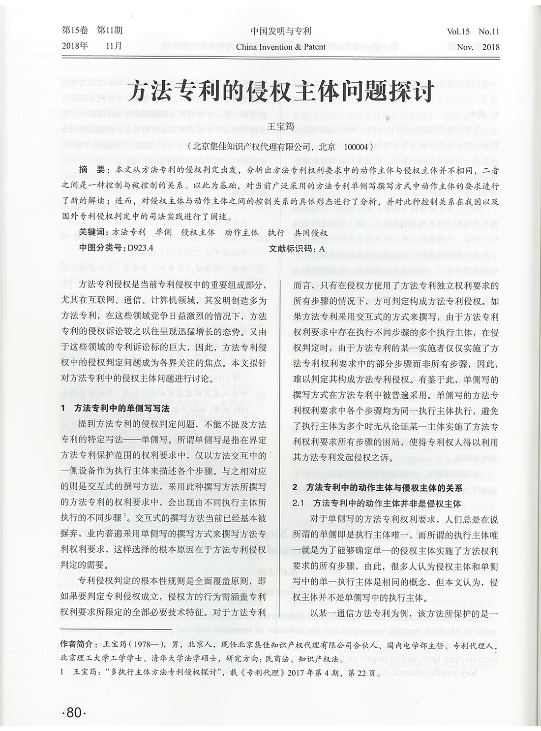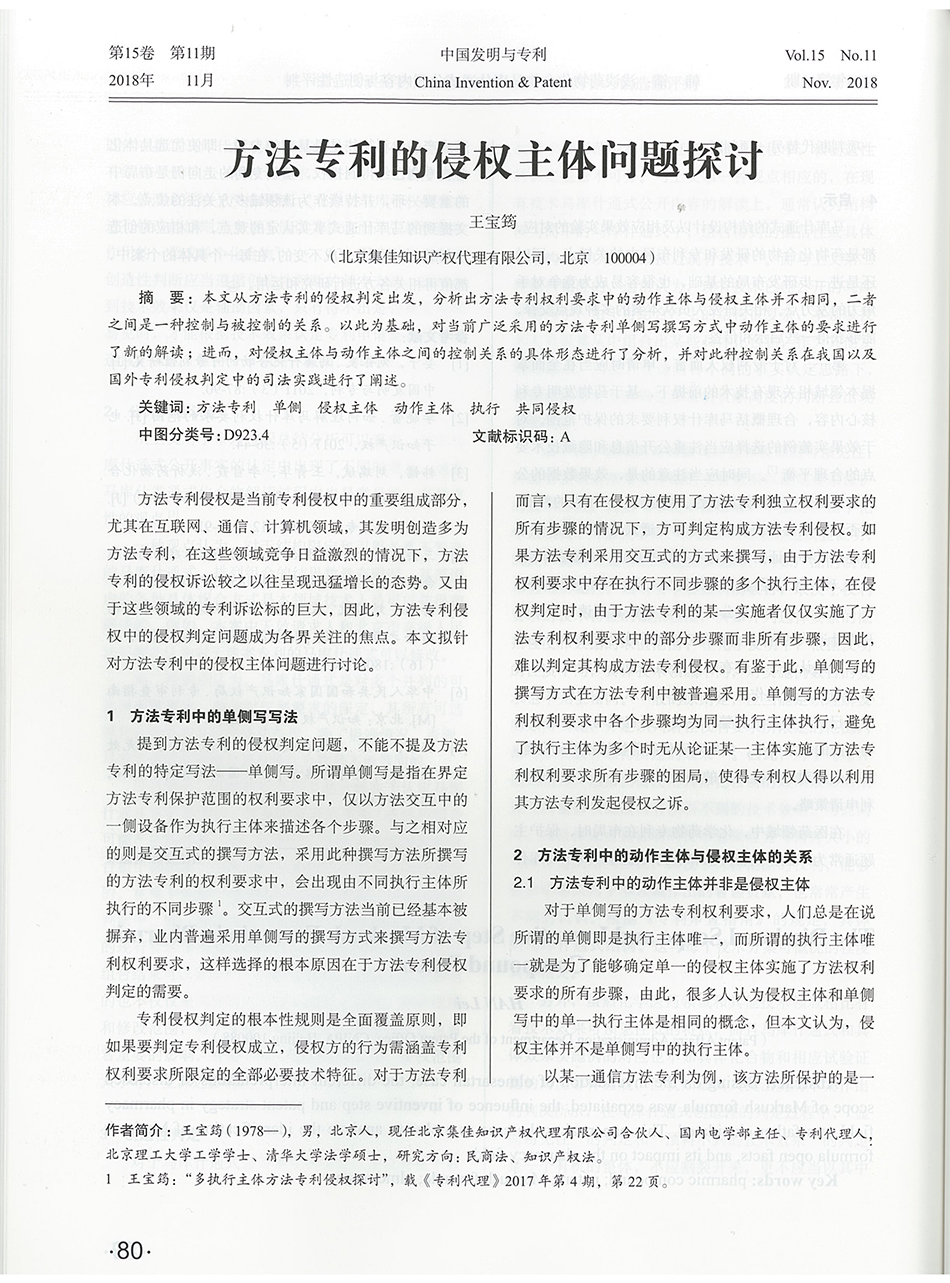 集佳文章《方法專利的侵權主體問題探討》在《發明與專利》發表