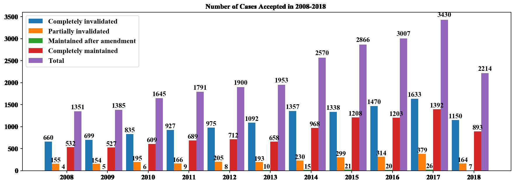【2】 It should be noted that the data published on the official website of the PRB per se have some problems (e.g., some decisions, especially those issued at early stage, are subject to information missing or error). Consequently, some data with error or those not usable are deleted in the statistical process. The statistical data are concentrated upon the decisions published from the year of 2008 to 2018. Due to the deletion of some decisions and the possible deficiency of the programmed algorithm, the statistical result below would be of error to a certain extent. Besides, since a decision of invalidation cannot be issued unless the invalidation case is closed, the cases not closed are not counted into the following statistical analysis.