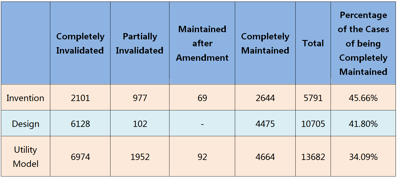 The above figure shows the number of the requests of patent invalidation accepted and closed from the year of 2008 to 2018. It follows that the number of the requests of patent invalidation has been increased year by year for the past ten years. About 50% of the cases accepted in each year were announced to be completely invalidated. Accordingly, counting the cases of being partially invalidated and those maintained after amendment, the decisions where the patent right is at least partially invalidated accounts for more than or almost equal to 60% of the accepted cases.