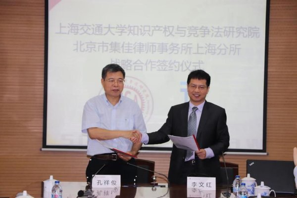 6月26日,北京市集佳律師事務所上海分所與上海交通大學知識產權與競爭法研究院戰略合作協議簽約儀式在上海交大徐匯校區凱原法學樓隆重舉行。上海交通大學知識產權與競爭法研究院院長孔祥俊教授、劉維副教授,北京市集佳律師事務所上海分所主任李文紅、資深顧問王俊河、合伙人李擘、合伙人張振軍出席簽約儀式。
