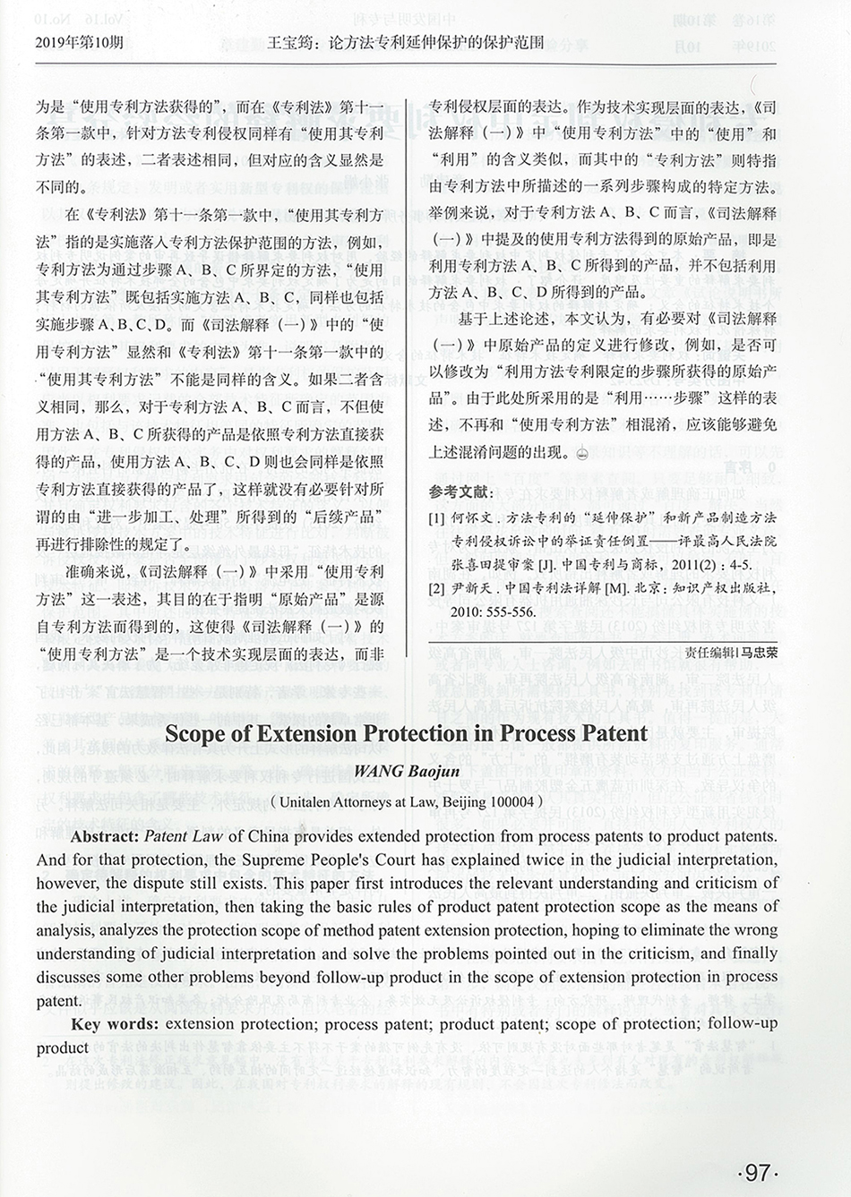 集佳文章《論方法專利延伸保護的保護范圍》在《中國發明與專利》 發表