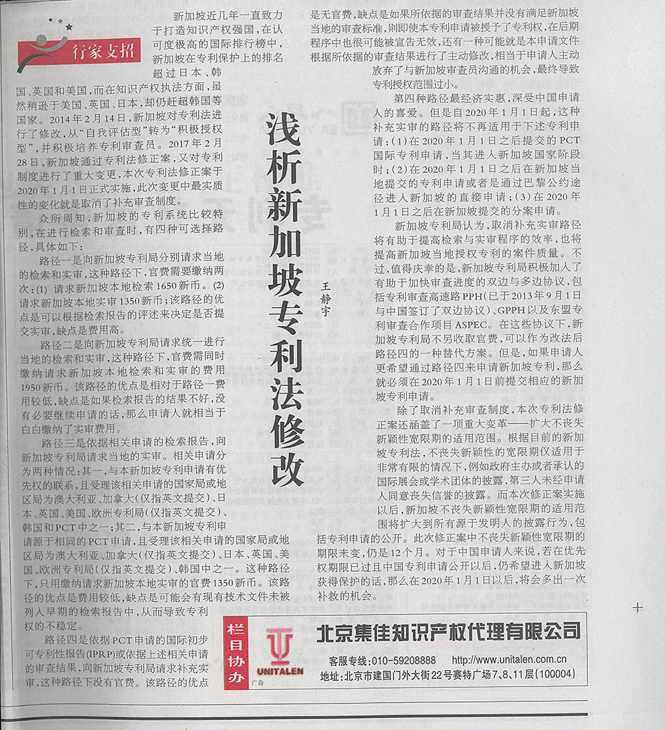 集佳文章《淺析新加坡專利修改法》在《中國知識產權報》發表