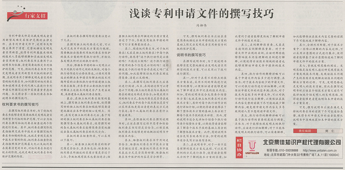 集佳文章《 淺談專利申請文件的撰寫技巧》在《中國知識產權報》發表
