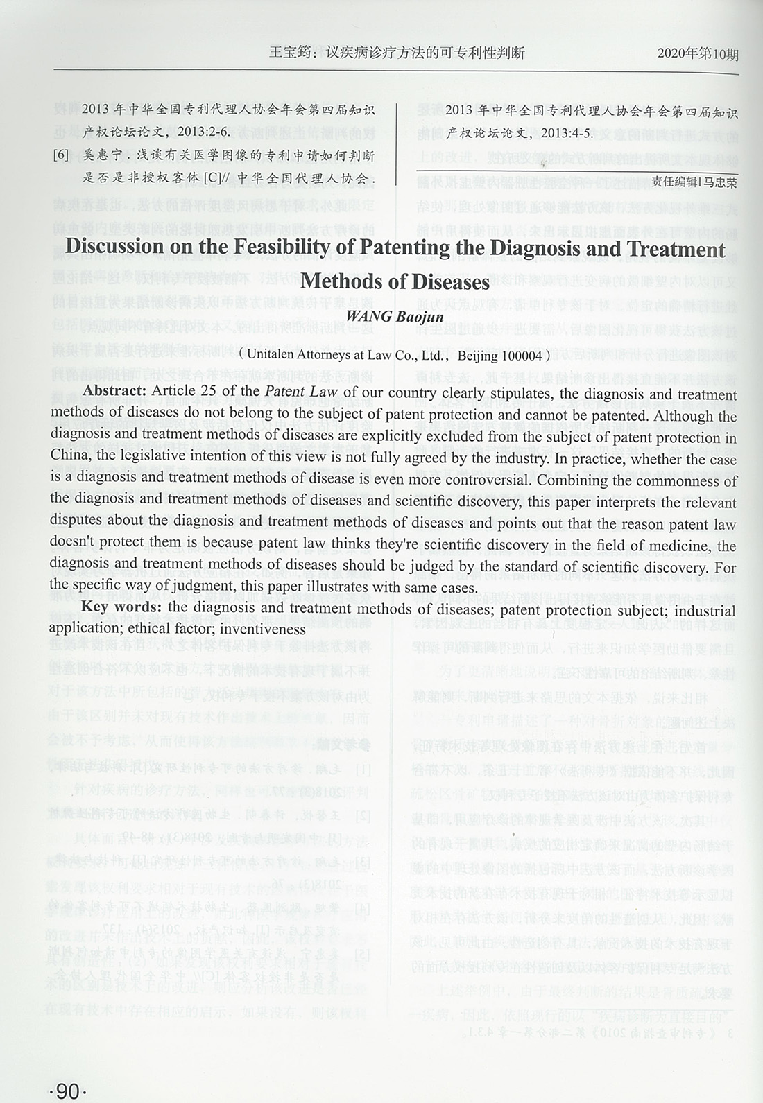 首頁 > 集佳知識產權代理有限公司 > 理論研究 > 媒體報道 > 集佳文章《議疾病診療方法的可專利性判斷》在《發明與專利》發表