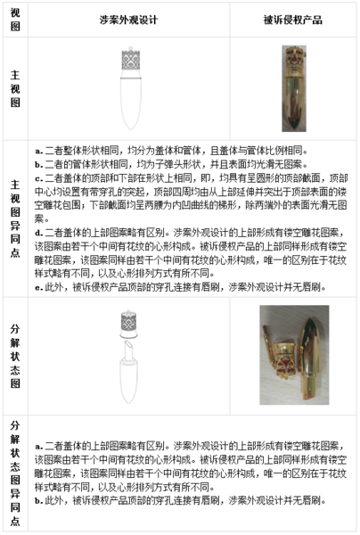 3、經過比對,被訴侵權產品設計與涉案專利的確存在以下兩點區別,即:(1)蓋體上鏤空雕花的具體圖案略有不同;(2)頂部穿孔處是否連接有唇刷。