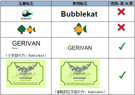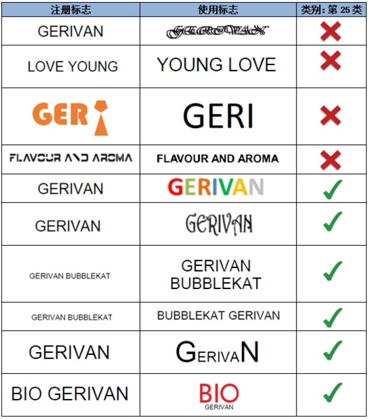 如上述示例,注冊商標指定在第32類礦泉水商品上,相較而言,圖形對指定商品具有一定暗示性,而顯著性較弱。因此,文字部分“GERIVAN”為該注冊商標的主要顯著部分。第一組中的使用標志僅是對圖形和文字的位置進行了調整,不影響文字部分的顯著性。而第二組的使用標志對文字進行了拆分,形成了新的商業印象,故視為實質變更。