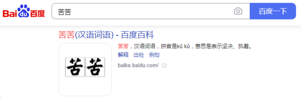 在對商標進行含義解釋時,萬不可將其割裂開來,進行個字認讀,應以商標整體構成要素進行統一認讀。申請商標“苦苦”為統一而不可分割的整體,系固有詞匯,具有固定的含義指向。常見于相關公眾的口語表述中,如辛辛苦苦、苦苦哀求等詞語,具有堅決、執著、懇切等含義。