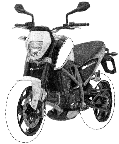 在線條圖中局部外觀設計以實線和虛線表示,比如下方圖1所示的摩托車,其保護范圍由實線決定,虛線表示不保護的部分。虛線的線寬需小于實線的線寬。