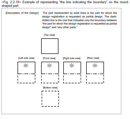 為了表達要求保護的局部外觀設計,可以借助于虛線和實線,或者可以使用不同的色塊,或者用點劃線來表示分界線。此外,日本還規定在外觀設計說明中通過文字明確請求保護的部分,比如指出實線所示的部分是請求保護的局部外觀設計,或色塊之外的其他部分是請求保護的局部外觀設計。