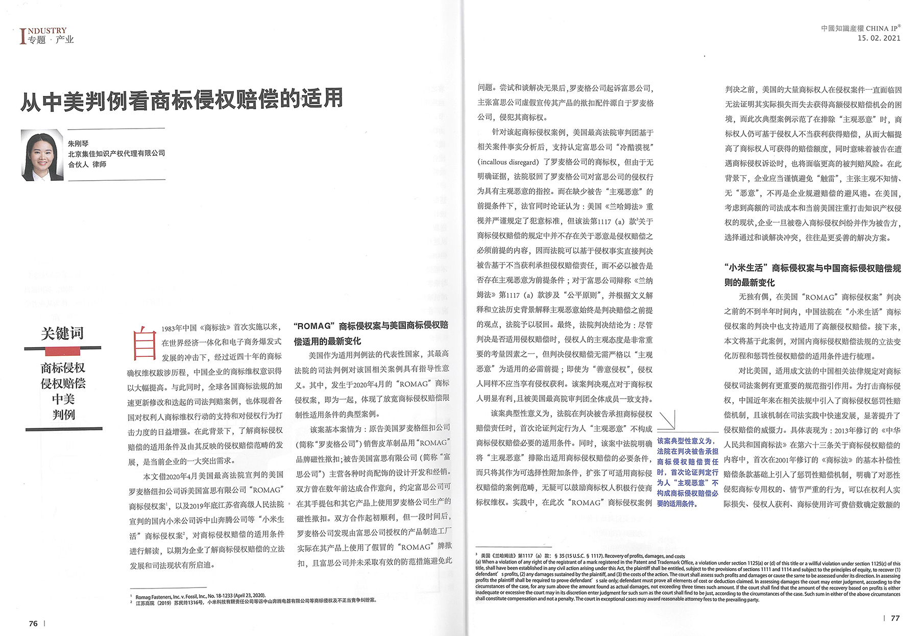 集佳文章《從中美判例看商標侵權賠償的適用》在《中國知識產權》發表