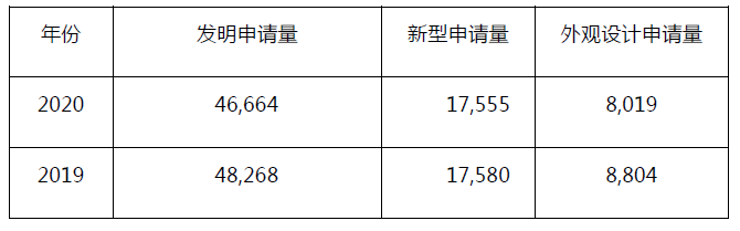 根據公布情況來看,中國臺灣智慧財產局2020年共受理72,238件發明專利申請,比2019年減少3.2%;其中受理發明專利申請46,664件,比2019年減少3.3%;受理新型專利申請17,555件,與2019年持平;受理外觀設計專利申請8,019件,比2019年減少8.9%。具體見下表: