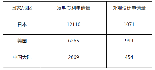 2020年向中國臺灣地區申請的前三大國家和地區申請量,見下表: