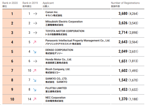 ?2020年前10位日本發明專利本國申請人