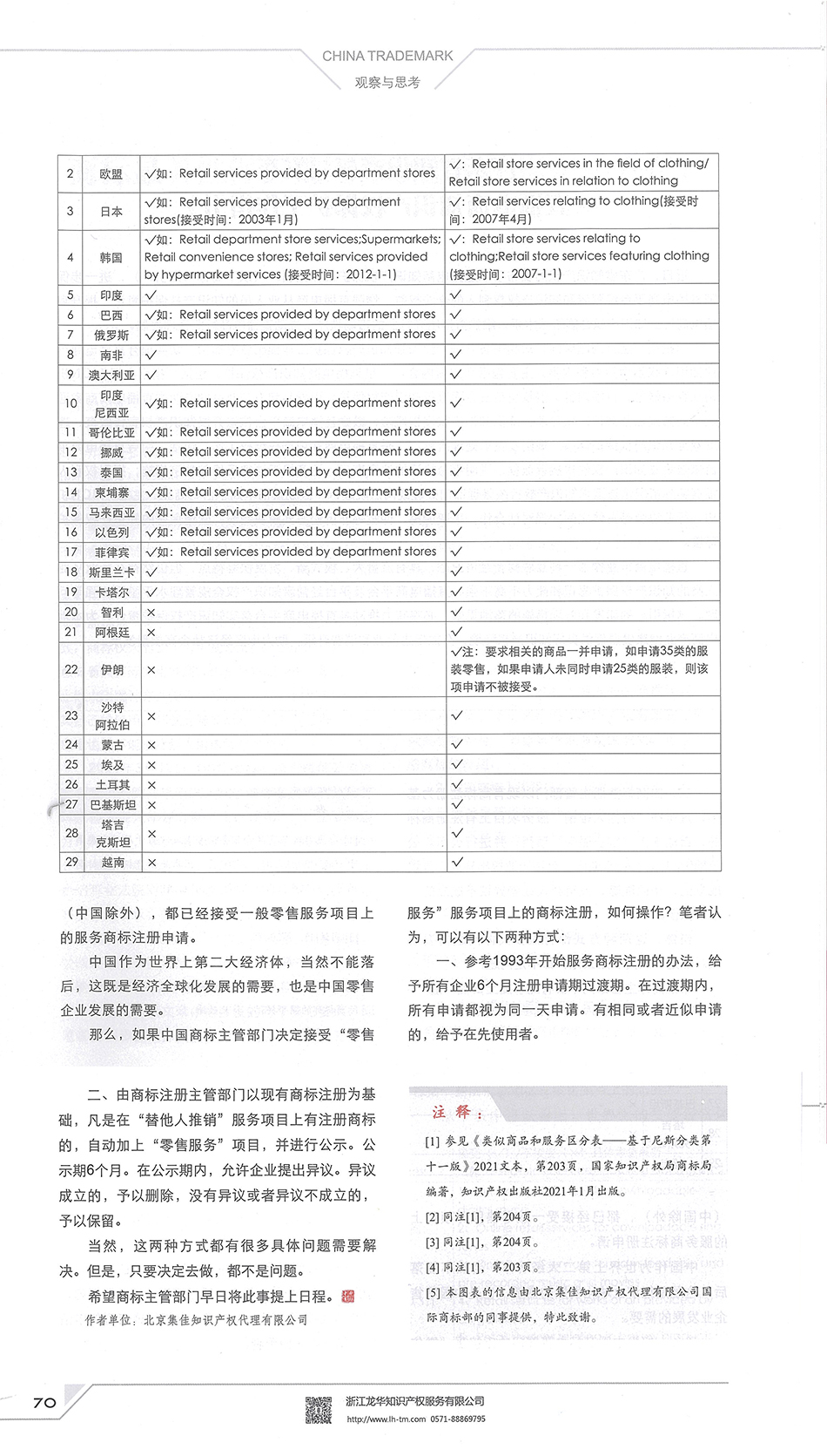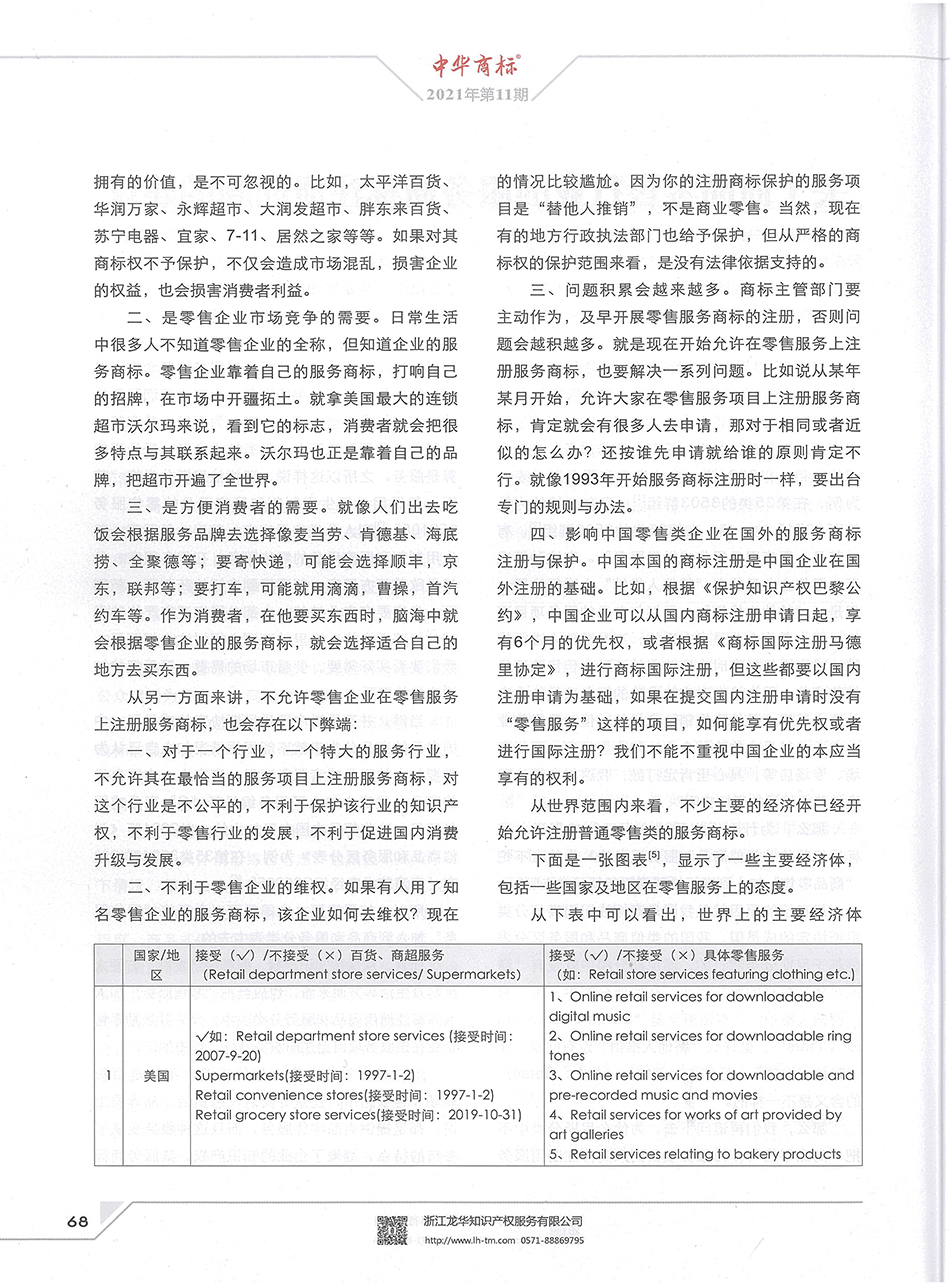 集佳文章《關于零售行業的服務商標注冊問題的建議》在《中華商標》發表