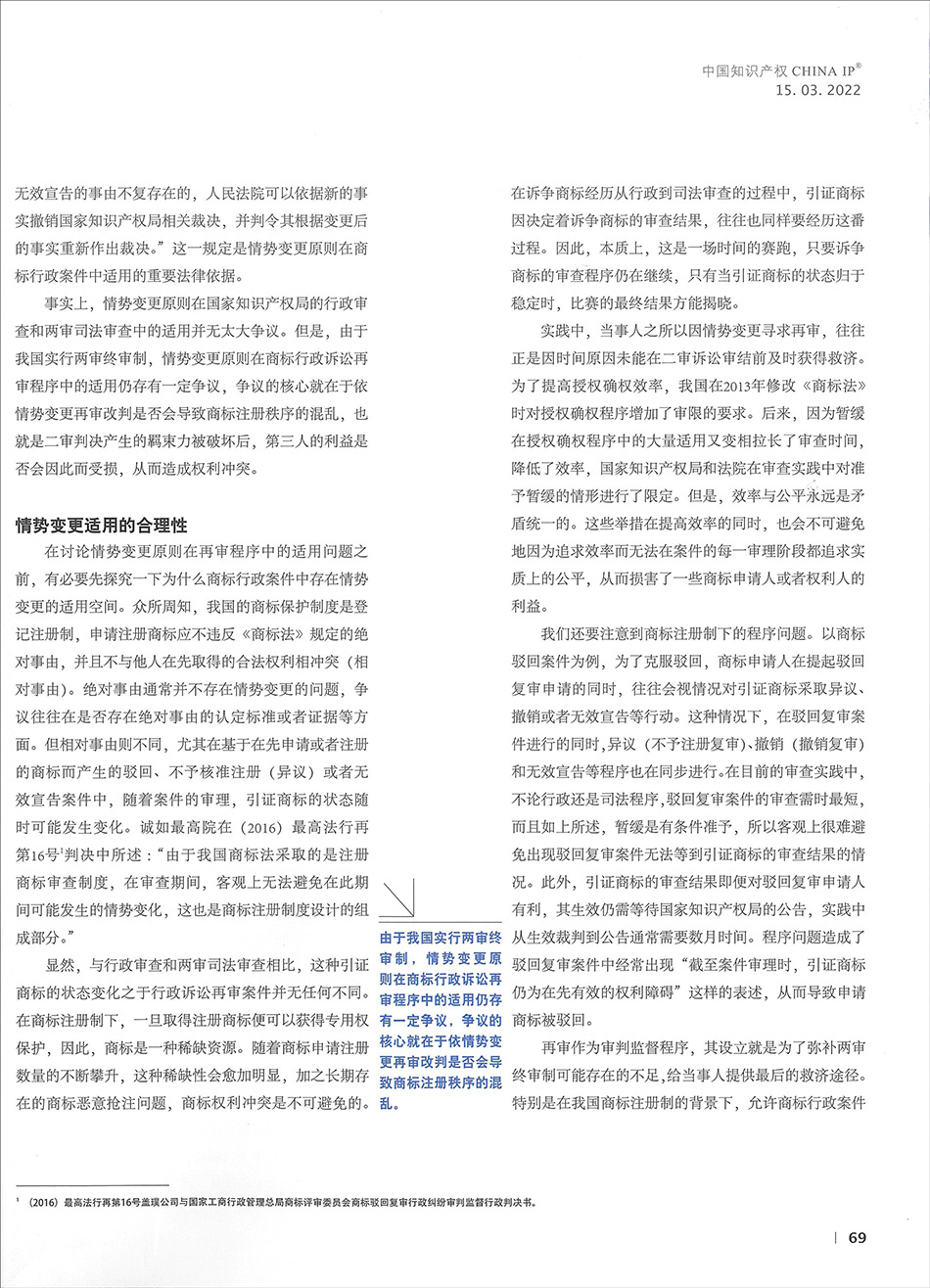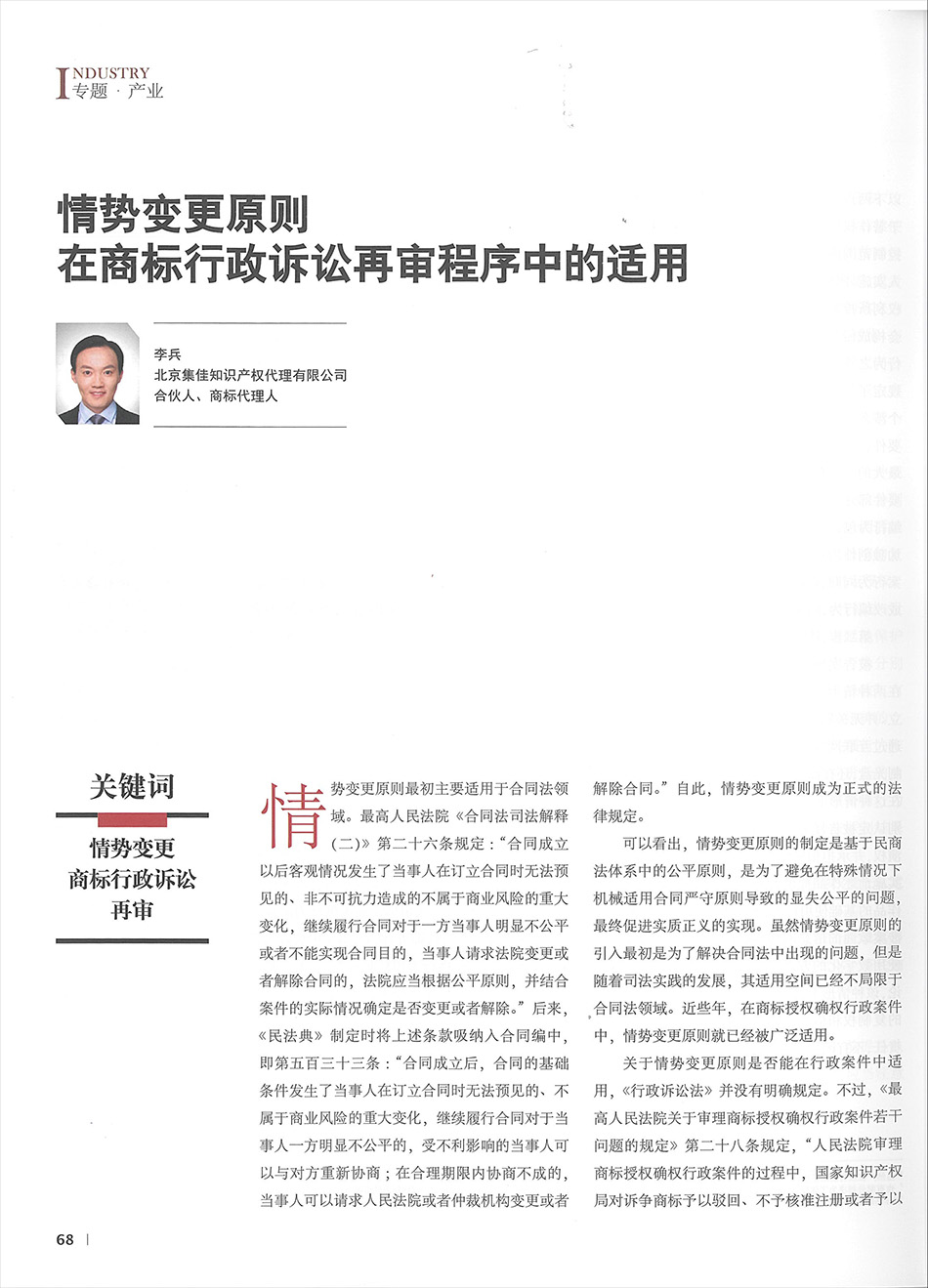 集佳文章《情勢變更原則在商標行政訴訟再審程序中的適用》在《中國知識產權》發表