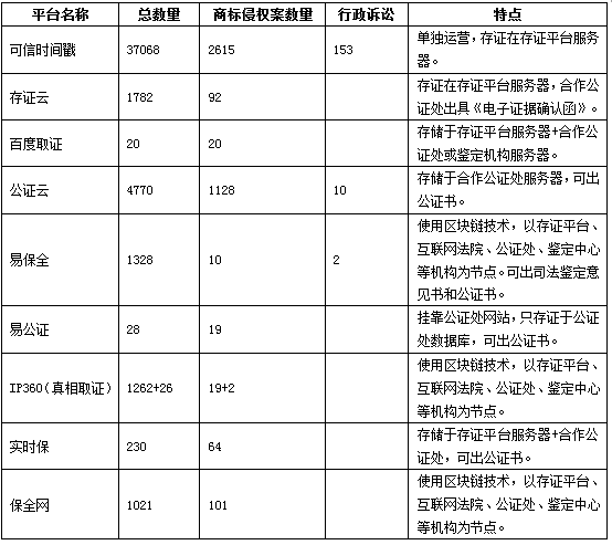 上述表格在一定程度上體現了各電子存證平臺的使用頻次。