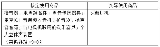 由《類似商品和服務區分表》可知,“頭戴耳機”為類似群組0908的規范商品名稱,而系爭商標的核定使用商品也均屬于類似群組0908。很顯然,實際使用商品和核定使用商品完全屬于相同的類似群組,構成類似商品。